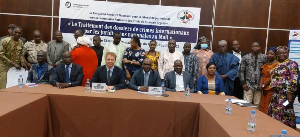 يتطلب تدهور حالة حقوق الإنسان في مالي استقدام المزيد من خبراء حقوق الإنسان المحليين المدربين. ويجب أن يكون هؤلاء المهنيون قادرين على صياغة وثائق قانونية بشأن انتهاكات حقوق الإنسان تستند إلى الاتفاقيات الدولية وما يقابلها من اختصاصات قضائية وطنية. ولمساعدة ممارسي حقوق الإنسان على فهم العلاقة بين الاختصاص القضائي الوطني في مالي والقانون الجنائي الدولي، قدمت مؤسسة فريدريش ناومان للحرية (FNF) في غرب أفريقيا واللجنة الوطنية لحقوق الإنسان في مالي (CNDH) تدريبًا لمجموعة مختارة من ممارسي حقوق الإنسان في ورشة عمل استمرت لمدة ثلاثة أيام في باماكو. وكان جميع المشاركين البالغ عددهم 35 مشاركًا من المحامين المحترفين، وكان معظمهم من محاميي الدفاع ذوي الخلفية في مجال حقوق الإنسان، الذين يعملون بتعاون وثيق مع اللجنة الوطنية لحقوق الإنسان. وقد أُولي اهتمام خاص بمحاكمة مرتكبي انتهاكات حقوق الإنسان التي يمكن أن تنشأ حصريًا في الإطار القانوني الدولي.