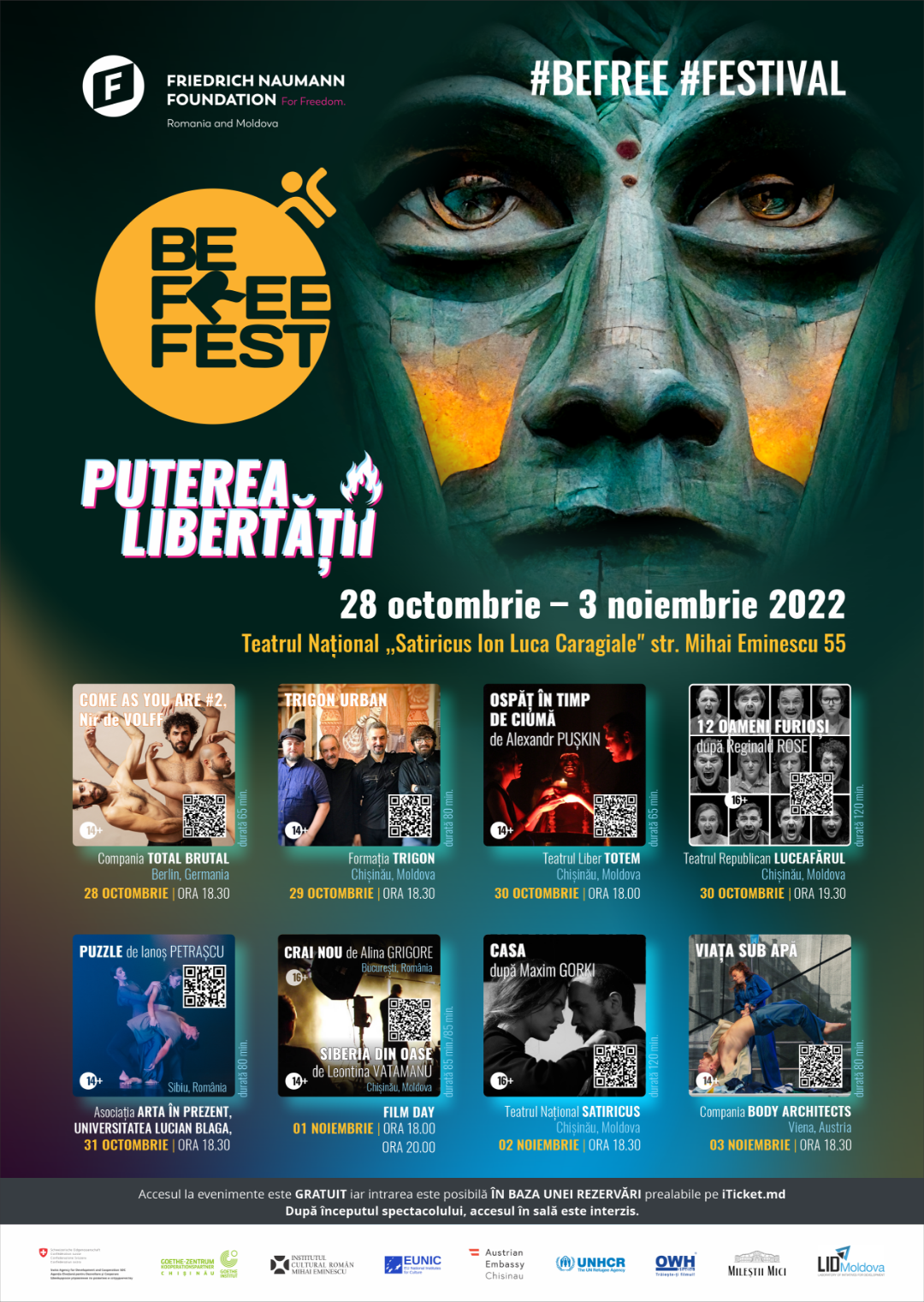 زار المئات من نشطاء الحرية المهتمين بالفن عاصمة مولدوفا، مدينة كيشيناو، في الفترة بين تشرين الأول/أكتوبر وتشرين الثاني/نوفمبر 2022، حيث أُقيم الاحتفال بالمهرجان الدولي للفنون المعاصرة تحت شعار #BEFREE FEST (#كن_حرًا) للسنة الرابعة على التوالي. يعتبر هذا المهرجان أكبر مهرجان من نوعه حتى الآن، إذ يضم تسع فعاليات ثقافية بمشاركة مجموعات فنية من ألمانيا (برلين) والنمسا (فيينا) ورومانيا (بوخارست وسيبيو)، وبالطبع من جمهورية مولدوفا (كيشيناو). وفي حين كانت مؤسسة فريدريش ناومان للحرية (FNF) الراعي الوحيد في البداية، يدعم المهرجان الآن مجموعة متنوعة من مختلف الشركاء، مثل معهد جوته والمعهد الثقافي الروماني ومفوضية الأمم المتحدة السامية لشؤون اللاجئين والسفارة النمساوية.