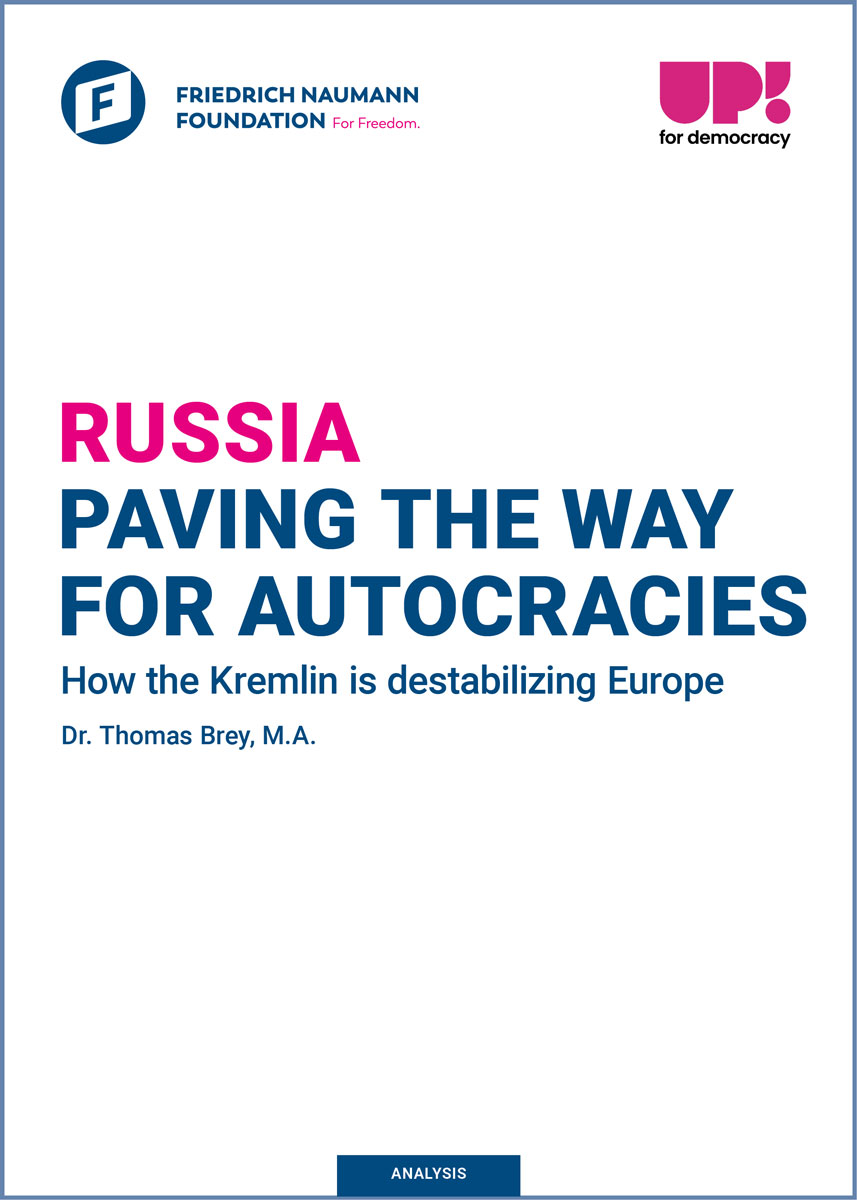 In this publication, “Russia – Paving the Way for Autocracies”, the author, Dr. Thomas Brey, has compiled an overview that, by highlighting the major developments, makes the destructive impact of Russian propaganda across Europe visible. In addition to propaganda, Russia is now able to influence the political landscapes of several countries through an “axis of autocrats” in ways that serve its interests.