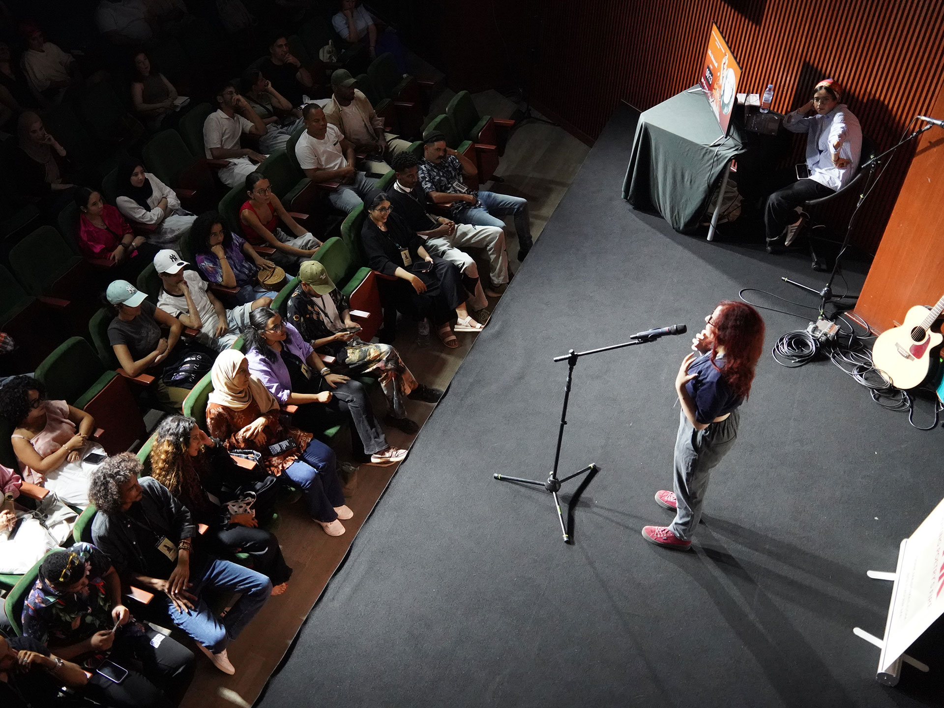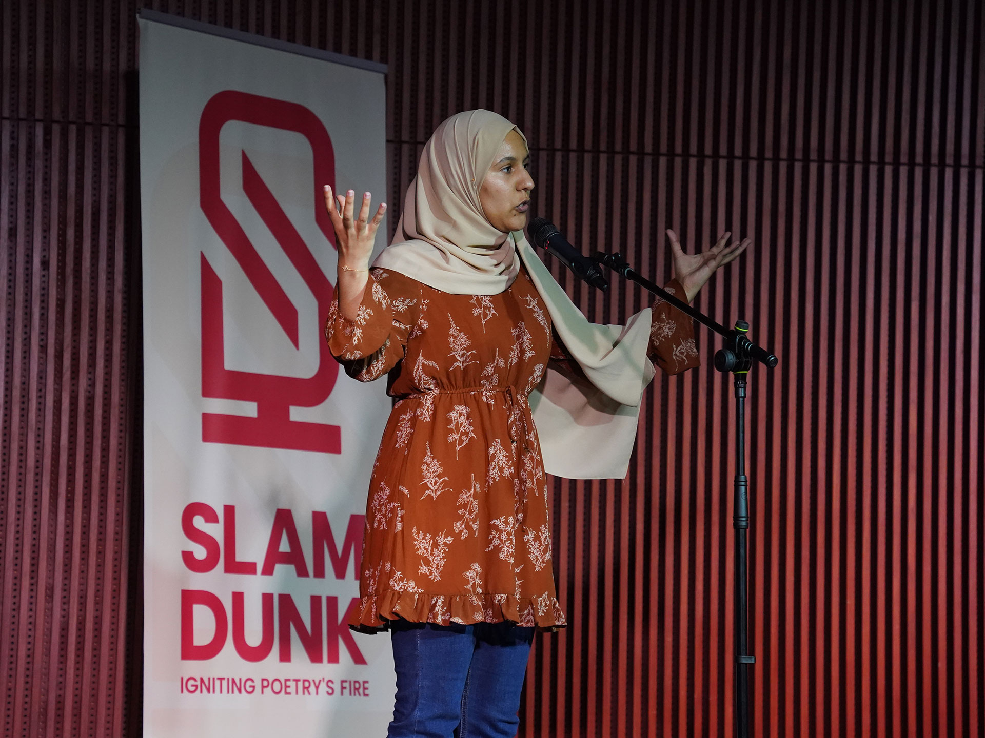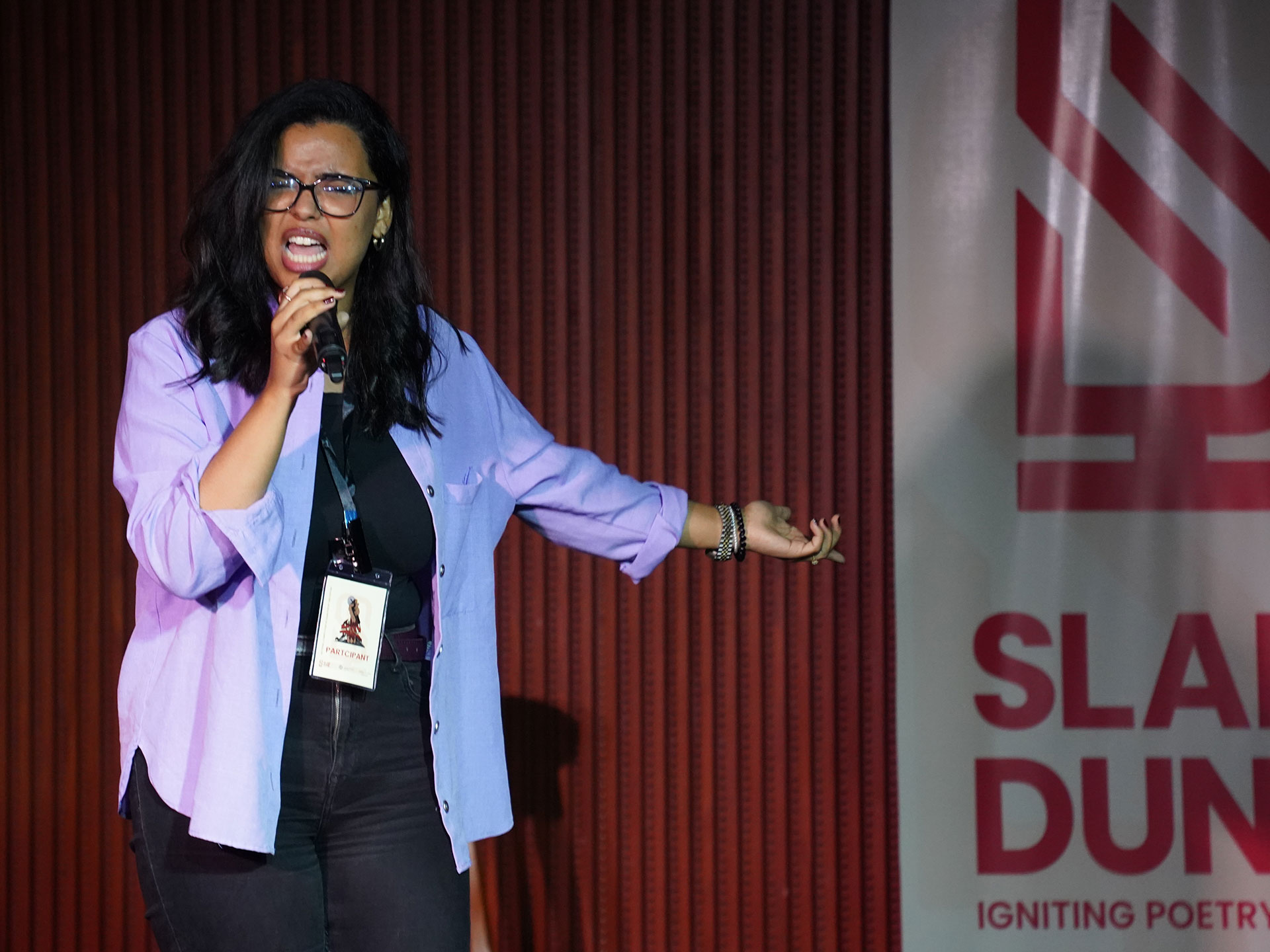 These are the opening lines of Hajar Ouknider’s poem “Raise your voice”, which she performed as co-organizer during the second edition of Slam Dunk – Morocco’s biggest slam poetry competition. On a long night in July at the American Arts Center in Casablanca, twelve poets captivated an enthusiastic audience, aiming to earn the judges’ favor to reach the finals and win. The competition offered young people a platform to literally raise their voices and boldly express themselves through spoken word, inspiring both onsite and online spectators to follow their example.