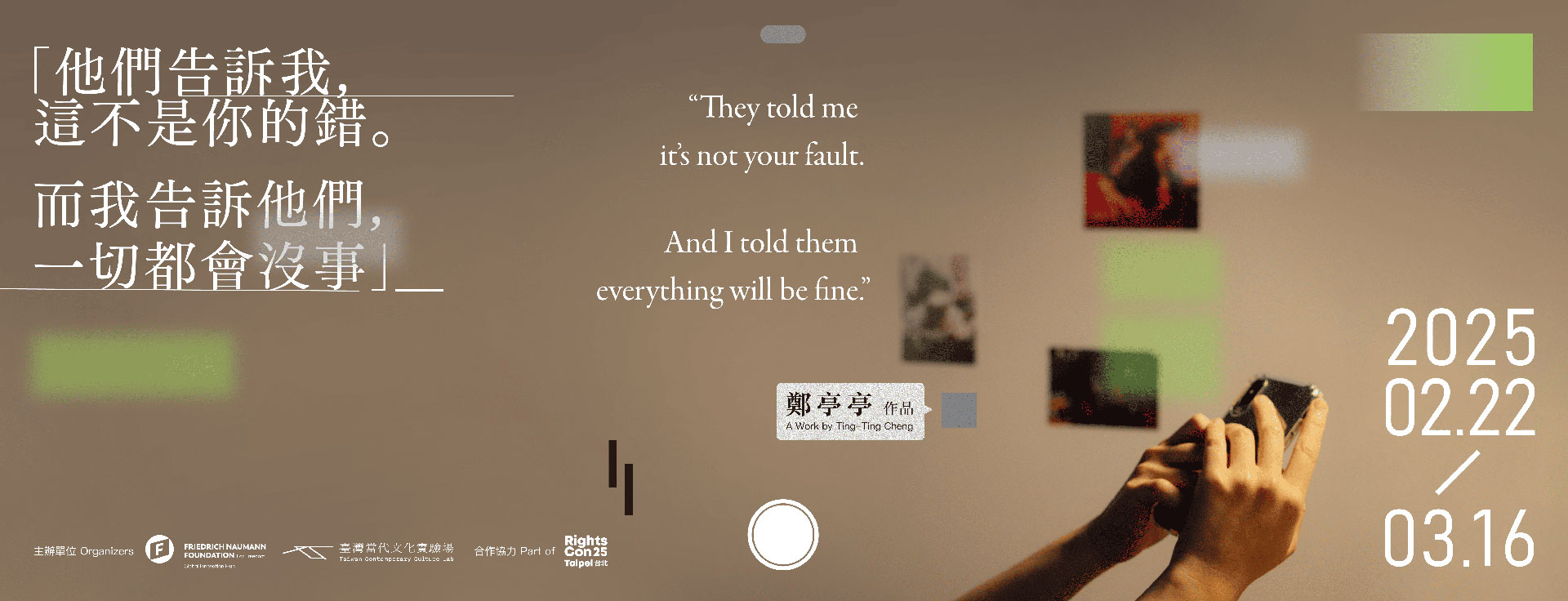 As an official side event of RightsCon 2025 in Taipei, the Friedrich Naumann Foundation for Freedom (FNF) partnered with artist Ting-Ting Cheng to present the exhibition ”They told me it’s not your fault. And I told them everything will be fine.”