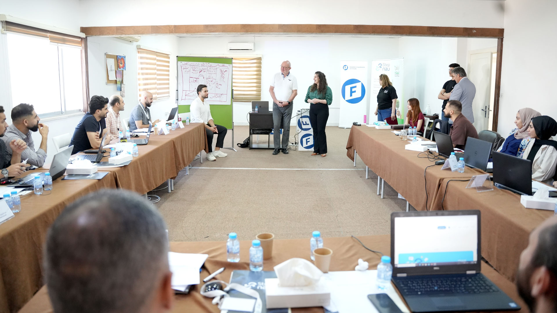 In response, the STEPNAU 23 and STEPNAU 24 programs aimed to empower refugees and Jordanian youth, particularly women, by developing skills in the digital economy and entrepreneurship. In 2023, the focus was on gender inclusivity, with 65% female participation, and practical training through workshops, business trips and a final hackathon where participants launched their businesses. STEPNAU 24 expanded on this, emphasizing economic empowerment as a human right. It offered online learning, mentorship and continuous support, maintaining a focus on economic participation while integrating human rights and sustainable livelihoods.